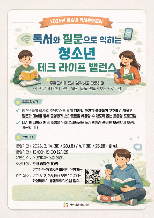 [서연이음터도서관] 2026년 청소년 독서문화교실 「독서와 질문으로 익히는 청소년 테크 라이프 밸런스」