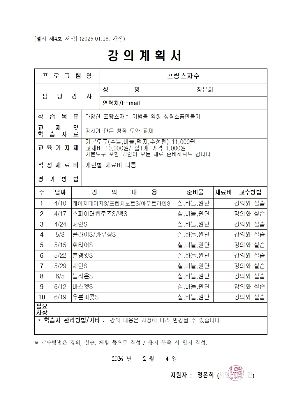 ▣ 재료비 : 재료비 별도(강의계획서 참고)
