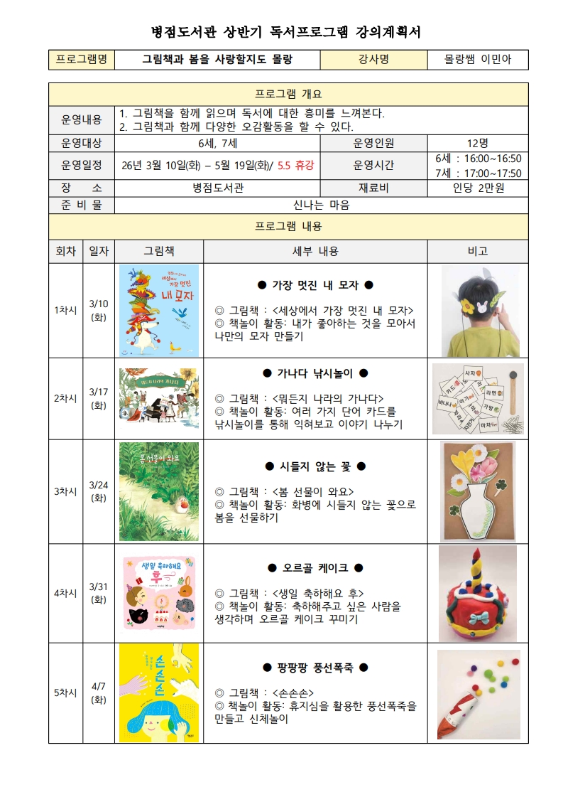 [2026 병점도서관 상반기 문화교실] 그림책과 봄을 사랑할지도 몰랑(7세)