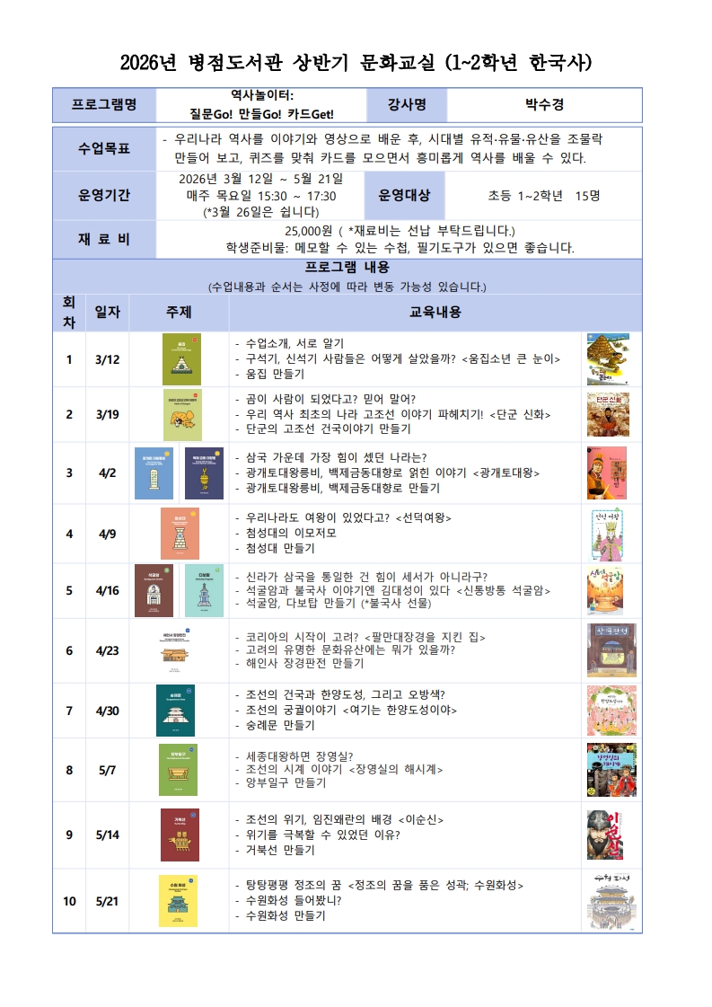 [2026 병점도서관 상반기 문화교실] 역사 놀이터 : 질문Go! 만들Go! 카드 Get(초1~2)