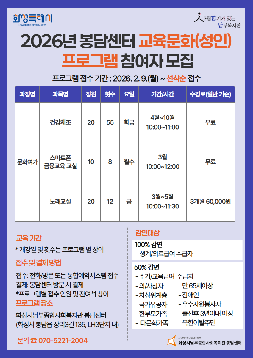 ▣ 신청방법 : 온라인 - 화성시 통합예약시스템 로그인 후 접수 / 봉담센터 전화 또는 방문 접수)