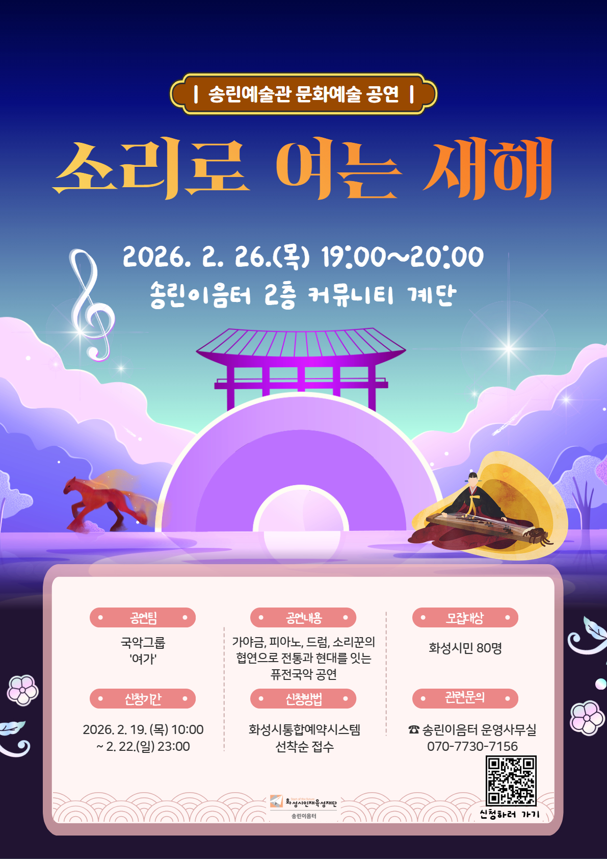 ★ 내용: 가야금, 피아노, 드럼, 소리꾼의 협연으로 전통과 현대를 잇는 퓨전국악 공연★ 모집 대상: 화성시민 누구나 / 선착순 80명
