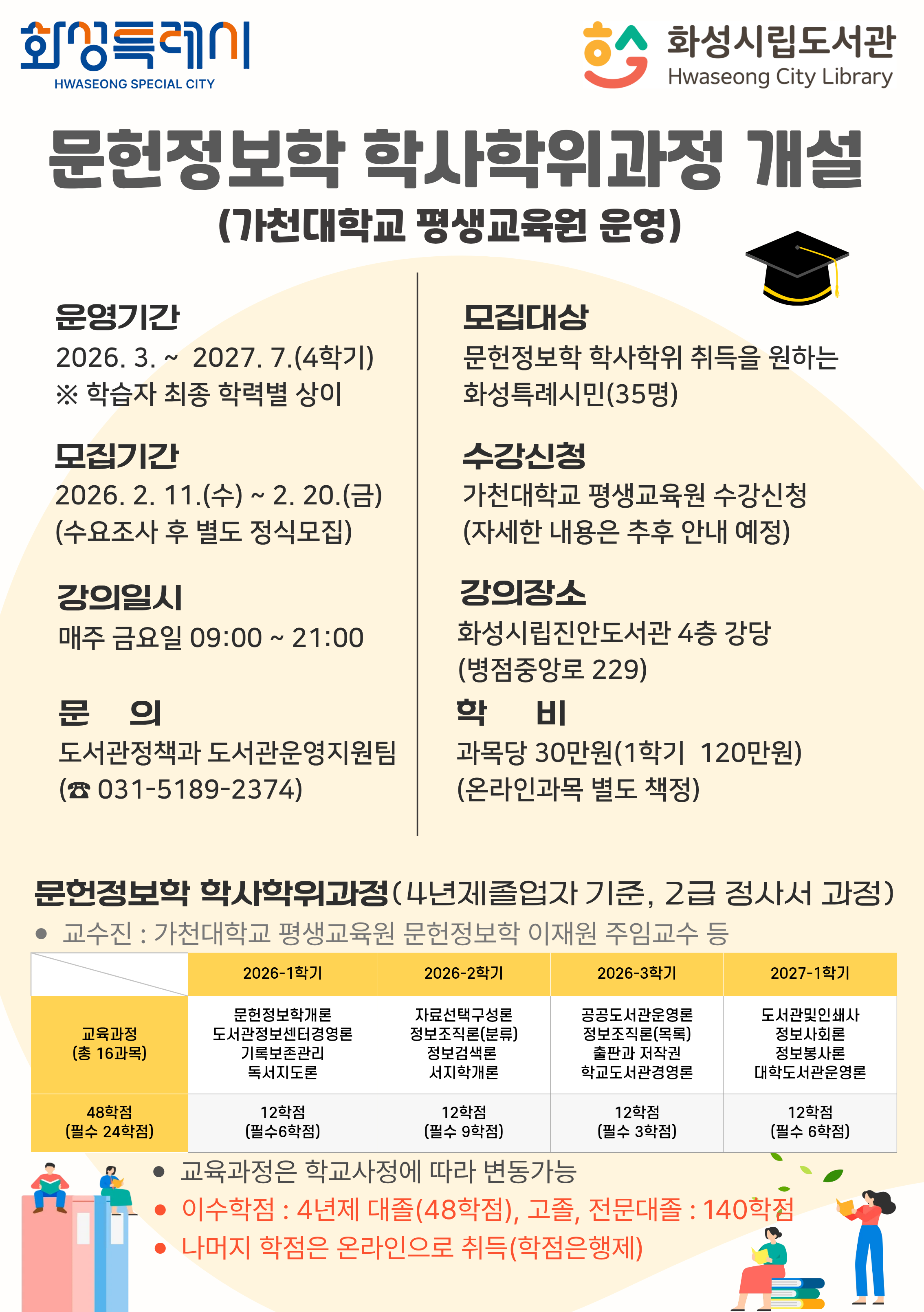 화성특례시와 가천대학교 평생교육원이 협업하여 문헌정보학 학사학위 과정을 개설합니다.