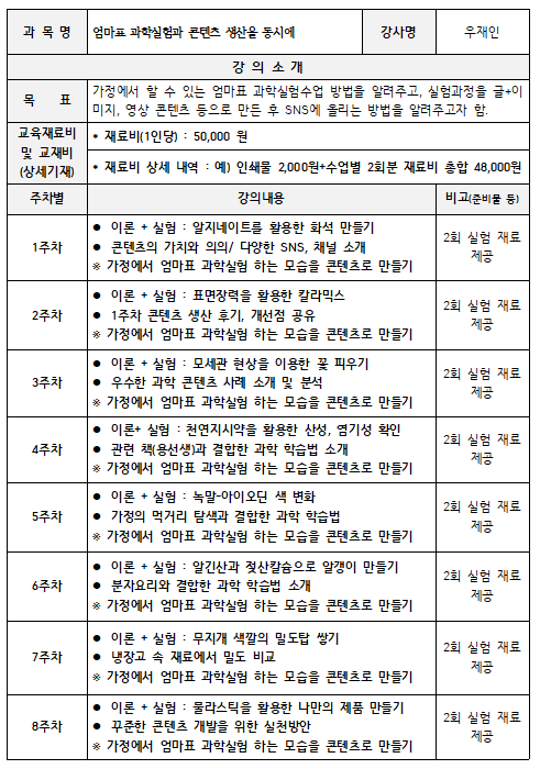 ○ 강의내용: 가정에서 할 수 있는 엄마표 과학실험을 배우고, 과학실험 콘텐츠를 SNS에 올리는 방법을 알아 보아요!