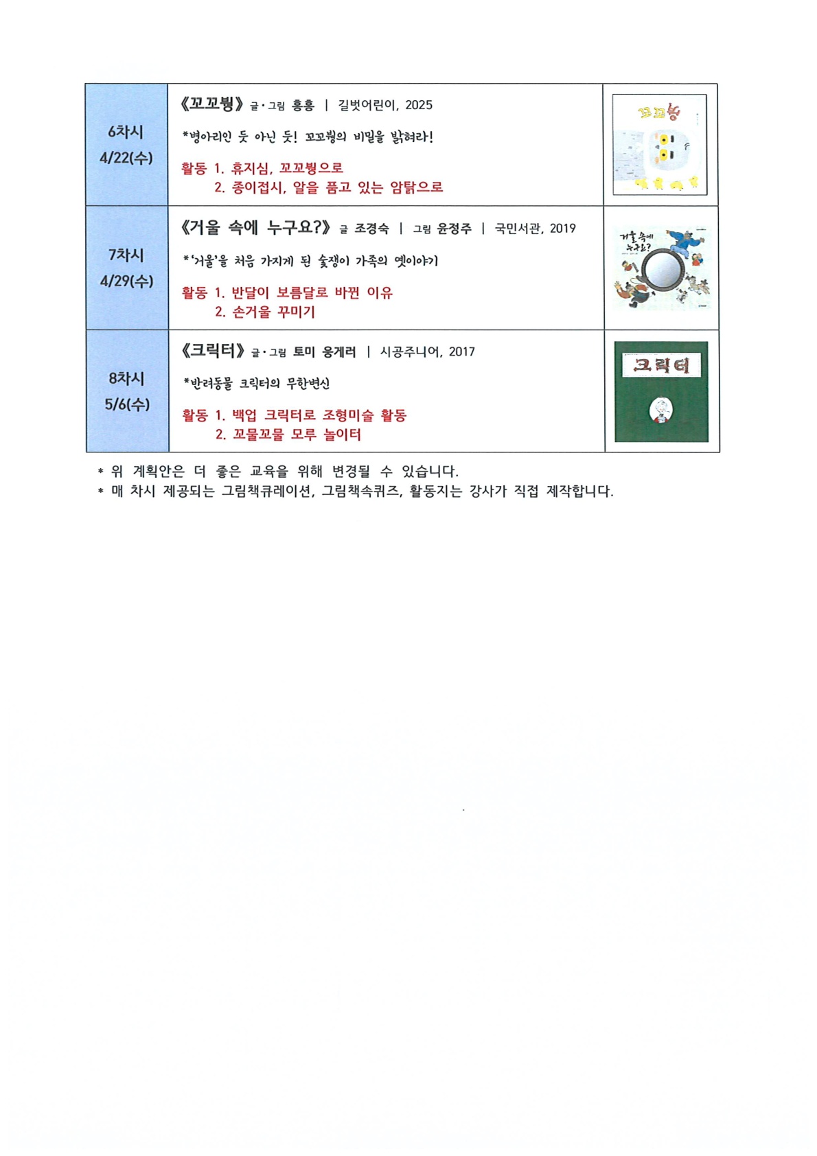 ○ 강좌 운영일 : 2026. 3. 18 ~ 5. 6 (수) 15:30~16:20(6세반)