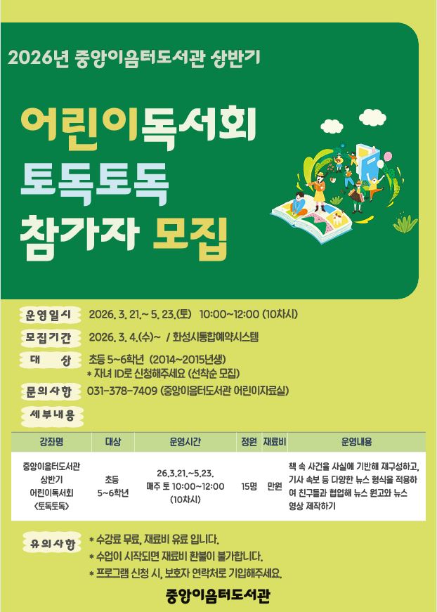 2026년 중앙이음터도서관 상반기 어린이 독서회 <토독토독> 수강생 모집