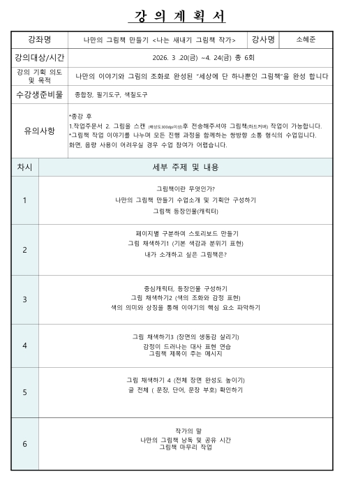 - 6주간 꾸준히 그림책 작업 분량을 완성해주셔야 합니다. 중도에 수강을 포기하거나 환불은 불가하니 신중하게 신청 부탁드립니다.