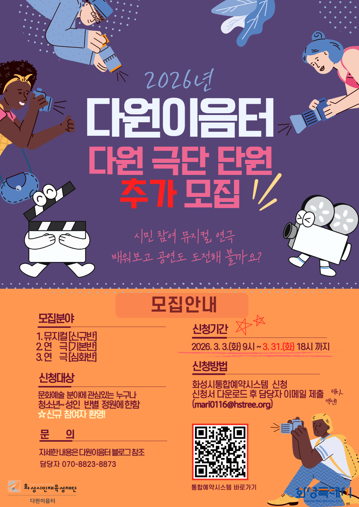 2026년 다원이음터에서는 문화예술 특화사업 뮤지컬, 연극에 참여할 단원을 모집합니다!