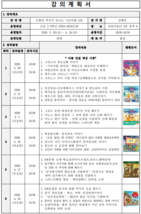 [다원이음터도서관] 상반기 어린이 독서문화교실<신화와 역사가 만나는 시간여행 A반>