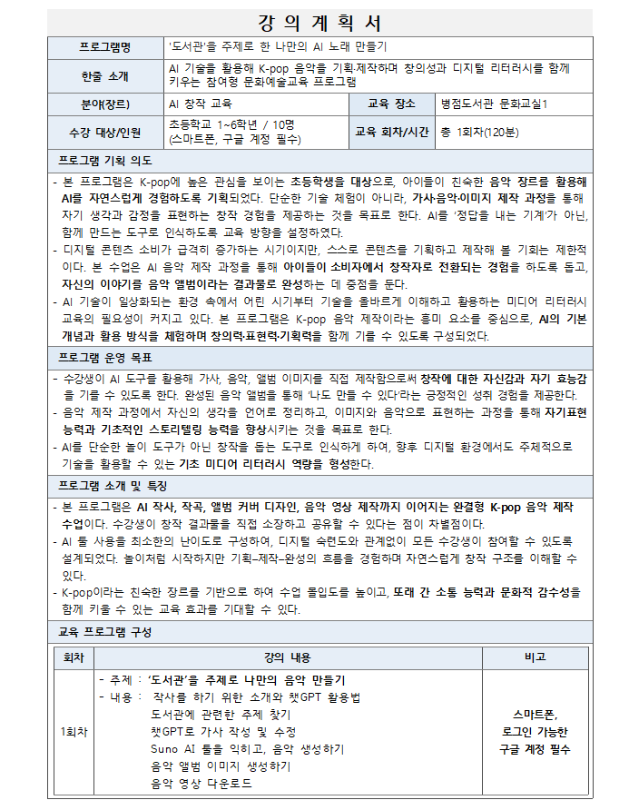 [병점도서관] 도서관의 날·도서관주간 <나만의 AI 노래 만들기> 특강(초등)