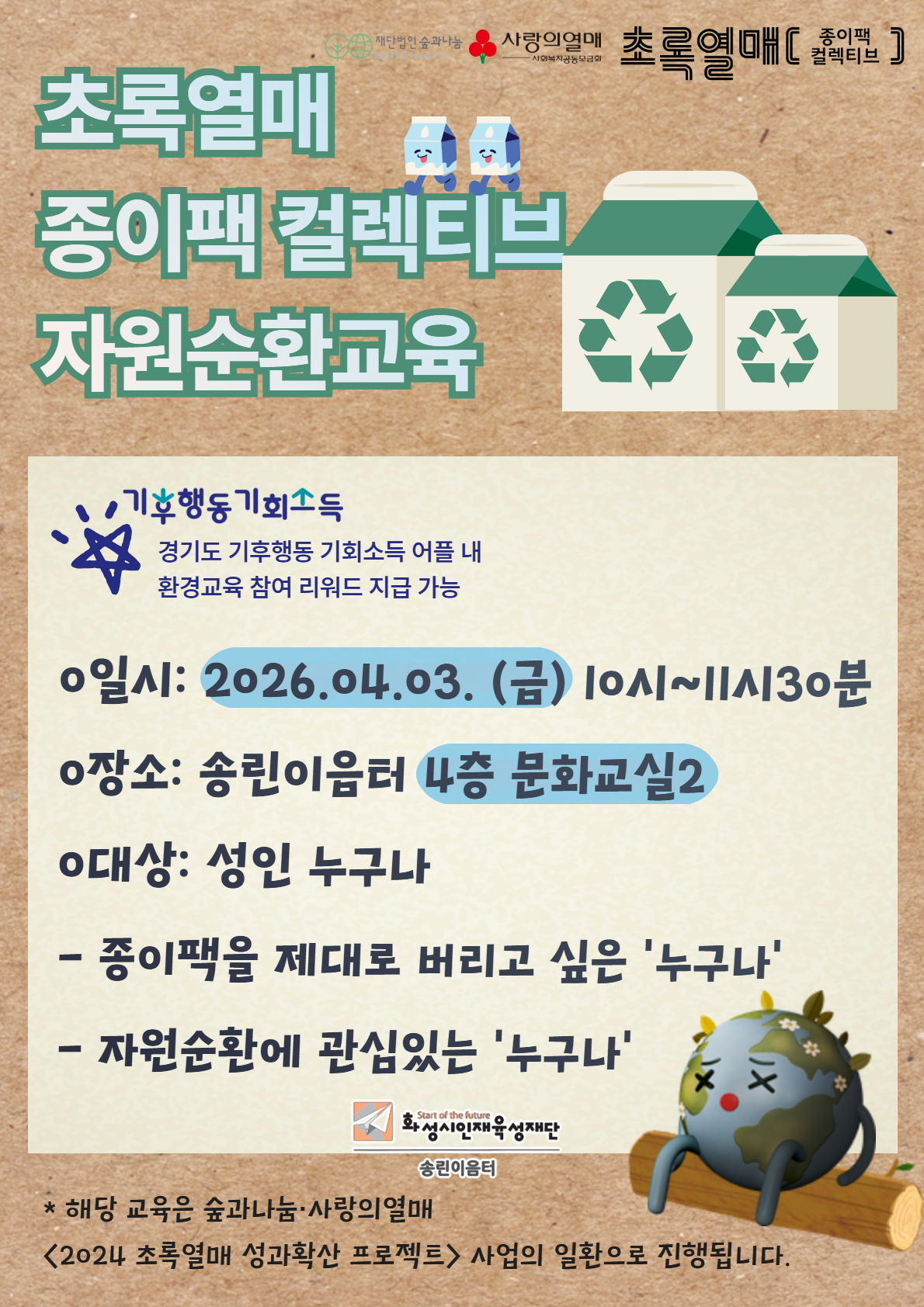 오는 4월 3일 금요일 <초록열매 종이팩 컬렉티브 자원순환 교육>에 참여해보세요