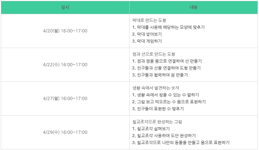 ◈ 운영 일시: 4/20(월), 4/22(수), 4/27(월), 4/29(수) 16:00~17:00