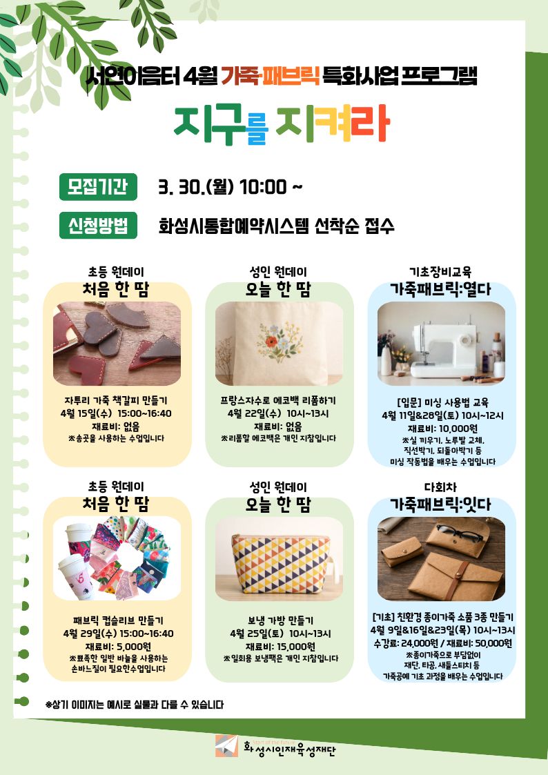 [서연이음터] 4월 성인 가죽·패브릭 원데이 프로그램 「오늘 한 땀: 프랑스자수 에코백 리폼」