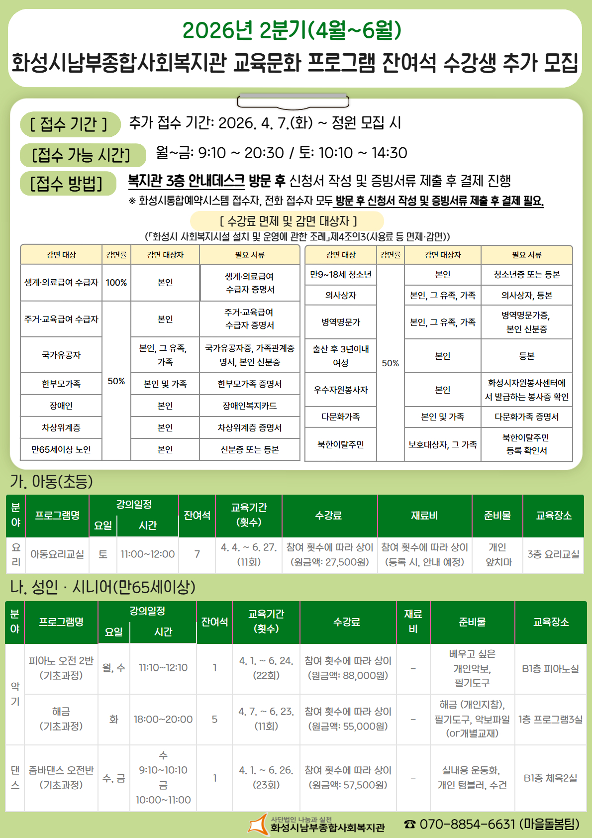 ※ 화성시통합예약시스템 상 접수 일자와 모집 일자가 겹치지 않기 위해 설정해놓아, 정확한 모든 일정은 홍보지를 참고부탁드리겠습니다.