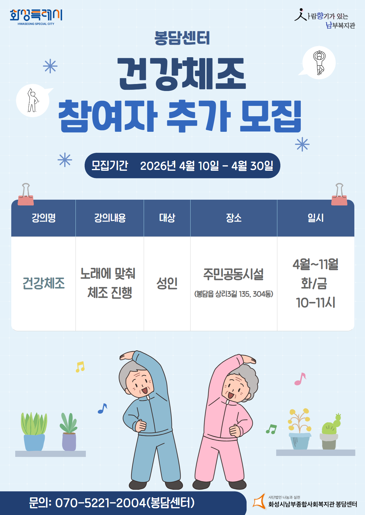▣ 신청방법 : 온라인 - 화성시 통합예약시스템 로그인 후 접수 / 봉담센터 전화 또는 방문 접수)