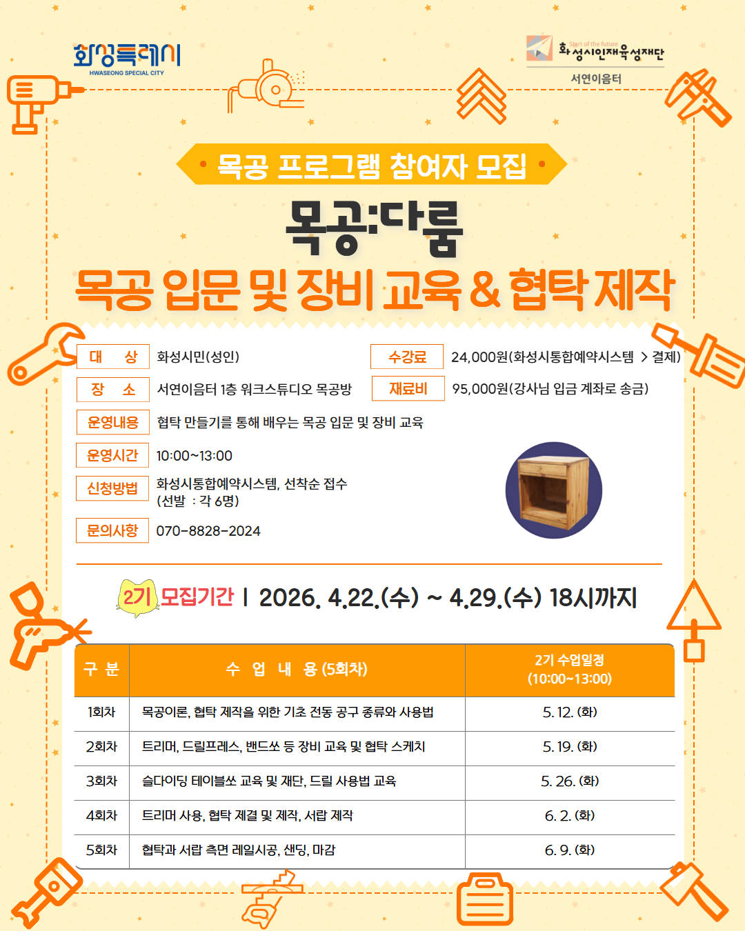 [서연이음터] 2026년 목공:다룸(장비 교육 포함) 2기