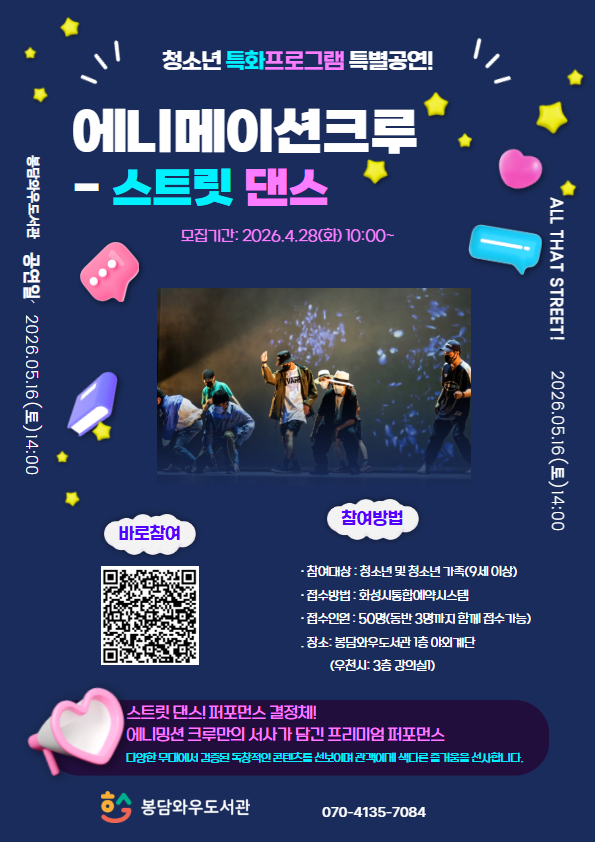 [봉담와우도서관] 특화프로그램 공연 <에니메이션 크루 -스트릿 댄스> (9세 이상 청소년및 청소년 가족)
