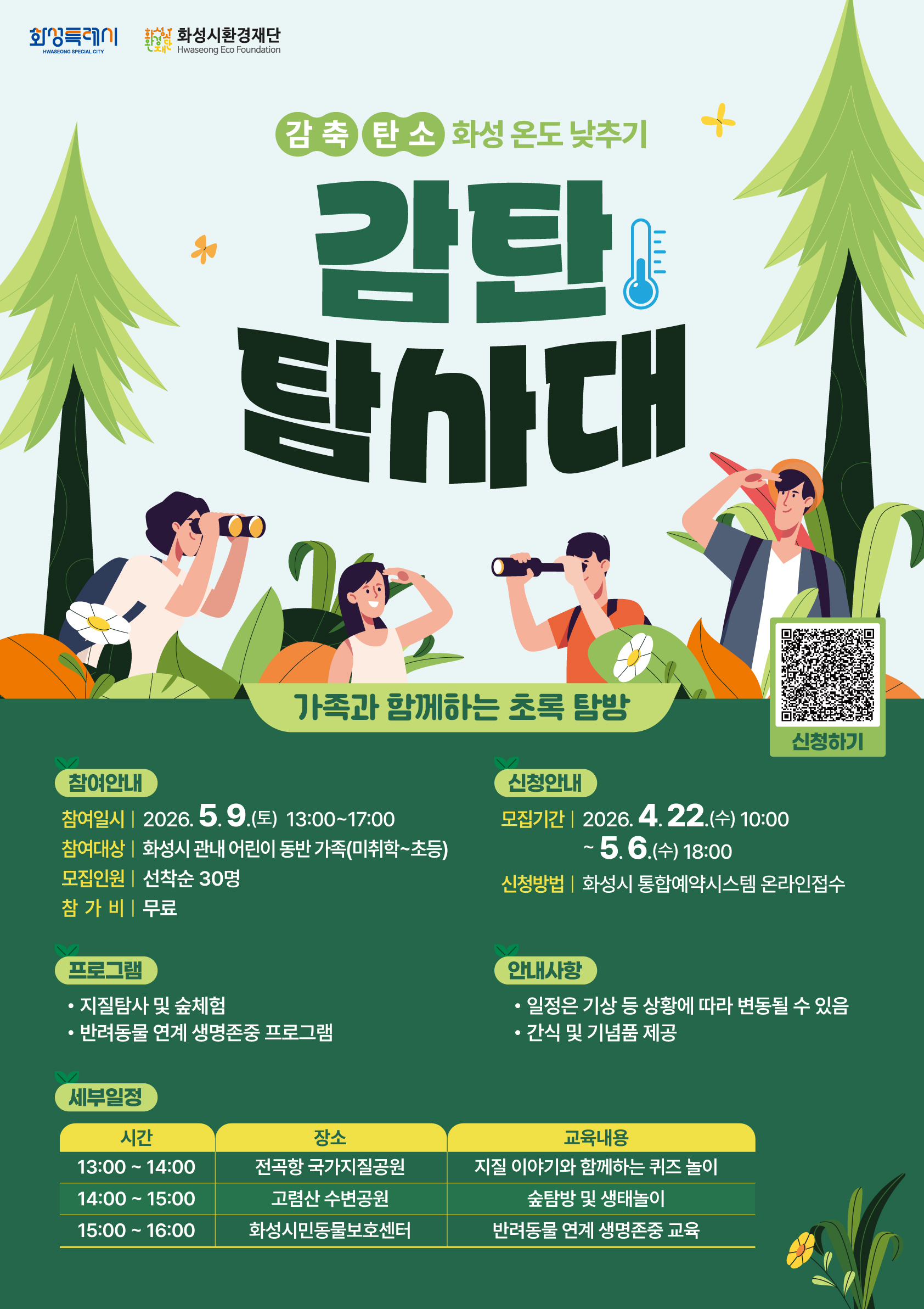 가족과 함께 화성시의 생태환경을 직접 보고 체험할 수 있는 「감(축)탄(소) 화성 온도 낮추기 – 감탄탐사대」 1회차 참여자를 모집합니다.