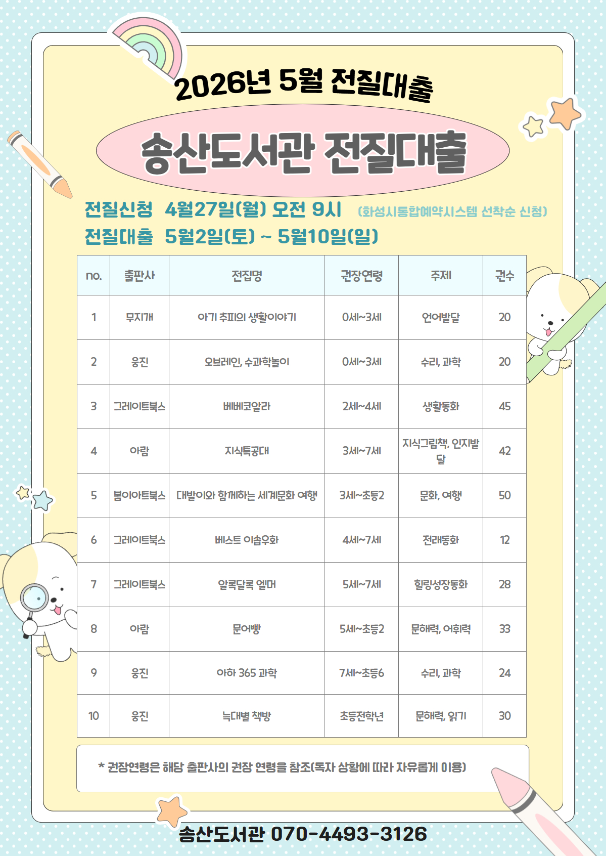 - 전집 대출/반납은 송산도서관 1층 어린이자료실에서만 가능