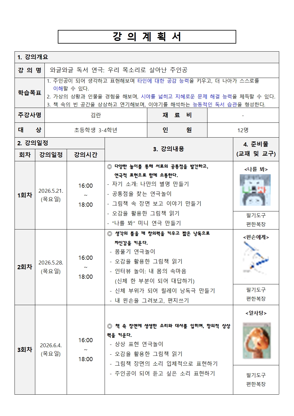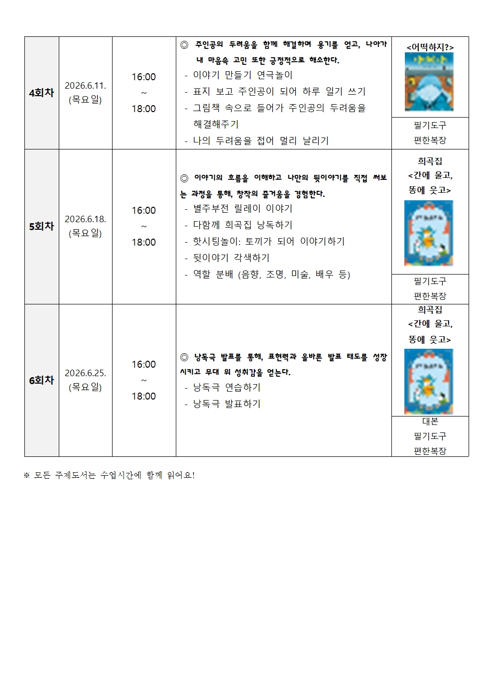 [서연이음터도서관] 2026년 아동독서회 - 와글와글 독서연극 (초등 3~4학년)